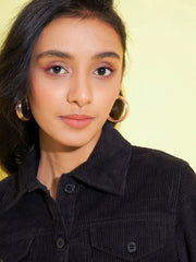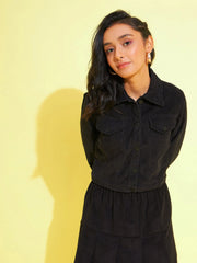 Black Corduroy Crop Jacket, in Corduroy fabric, Polyester Lining, Crop Length, Comfort Fit, Button Closure, Straight Hemline and features Metal Button Detail At Front